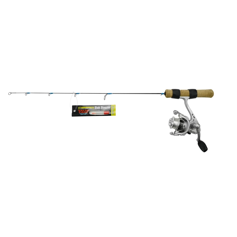 Slab Stopper ice combo features graphite composite blank, lightweight, black anodized wire guides and genuine cork handle with reel seat rings and hook keeper. Comes paired with two bearing, infinite anti-reverse Accu-Cast style spinning reel pre-spooled with line.
