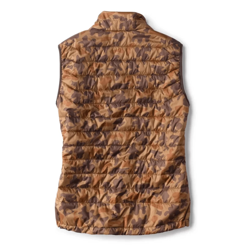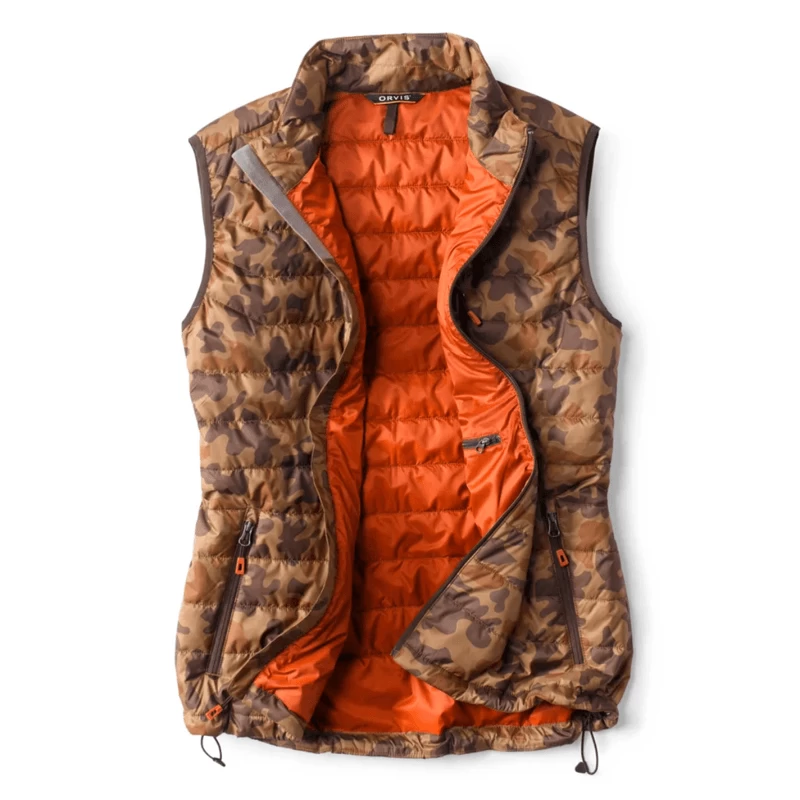 Lightweight warmth is critical when layering for colder weather—to achieve that, Orvis created the Recycled Drift Vest, their most eco-friendly, insulated outerwear yet. The DWR-treated shell is made of 100% recycled polyester in a rugged ripstop weave; the insulation uses 55% post-consumer recycled fibers. The ultimate synthetic insulation for warmth-to-weight ratio, bluesign-approved, top-of-the-line, packable PrimaLoft Gold retains warmth even when wet. Soft, tricot-lined (and zipped) handwarmer pockets provide extra protection from the cold, as does the cinch at the waist. Chevron-quilted with a stand collar and a chest pocket. The vest stuffs into its internal zipped pocket. Active fit.