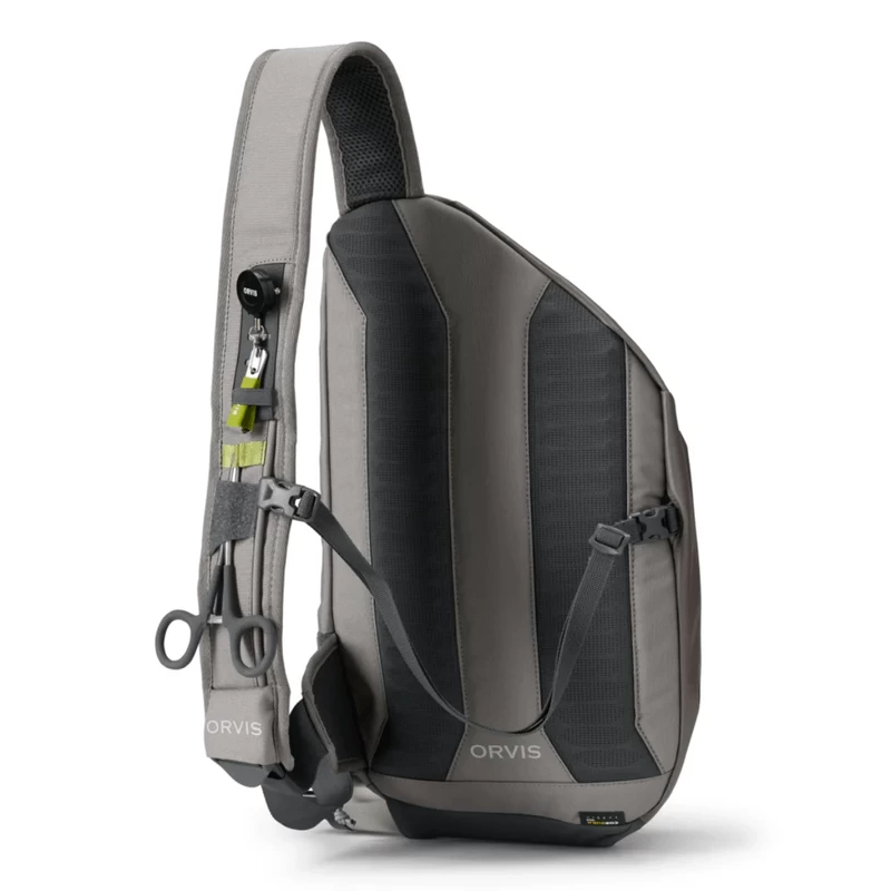 Carry everything you need in an easy-to-access design without it getting in your way with the Orvis Sling Pack. Featuring 11L of cargo space, this pack is perfect for packing all your necessities. A Tippet Whippet receded docking station comes with a tippet bar that allows hassle-free access to as many as 6 spools. The roomy main compartment boasts a zippered interior pocket with key fob and stretch mesh pockets for organizing your gear. This fishing pack has a drop-down zippered pocket with elastic mesh slip pocket, while a low-profile pass-through offers easy access for your nippers or a zinger. An integrated water-bottle holder secures your hydration, plus the front of the strap features a host of tool attachment points. Built for slinging over the left shoulder so your casting arm (sorry southpaws) remains free.Â